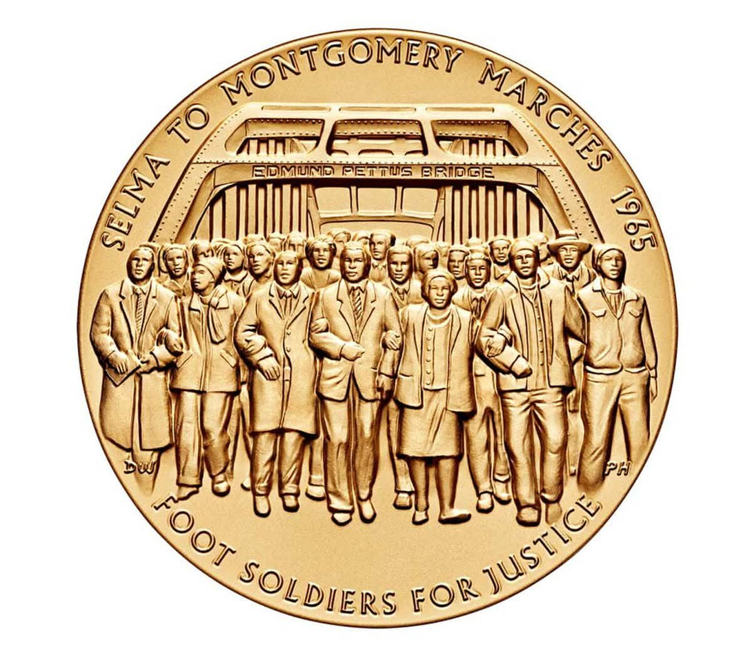The front of the medal features a powerful image of civil rights marchers crossing the Edmund Pettus Bridge—a symbolic moment during their 54-mile journey to the Alabama state capitol.