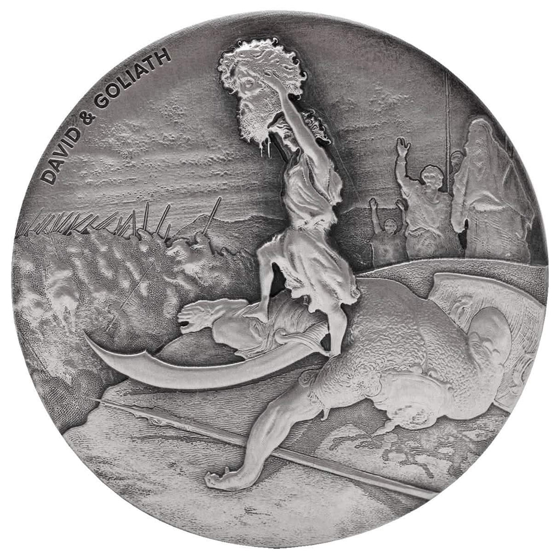The high-relief design intricately depicts the dramatic confrontation between David and Goliath, with David poised to take the decisive shot while Goliath stands towering and menacing in the background. The fine details emphasize David’s confidence and courage, while the antique finish adds depth and texture, giving the coin a timeless, heroic quality that brings this biblical story to life.
