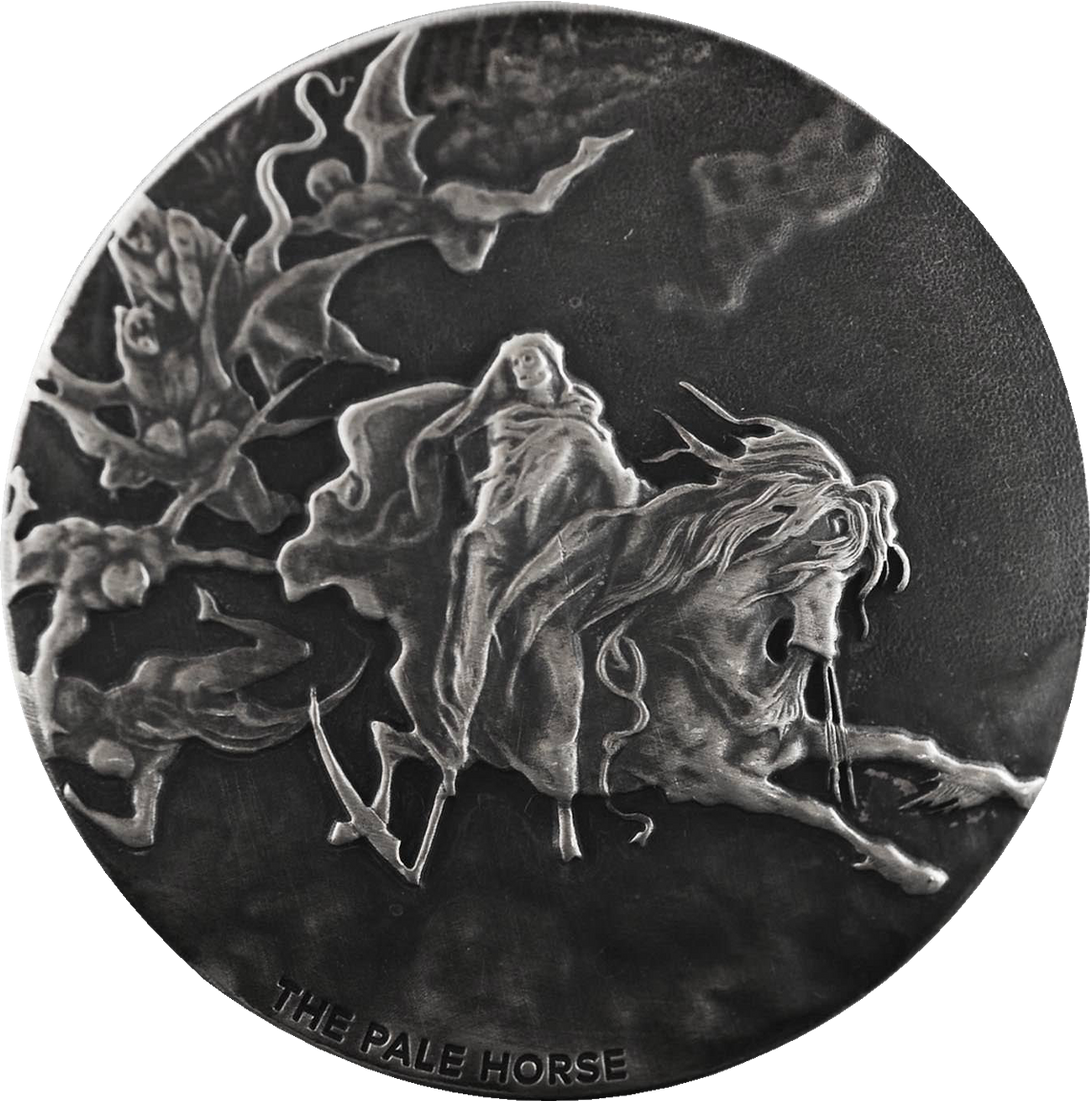 The high-relief design intricately portrays the Pale Horse, ridden by a skeletal figure, symbolizing death, with the landscape in the background depicting the desolation and destruction associated with the rider. The fine details of the horse, rider, and the barren landscape are brought to life with stunning artistry, while the antique finish adds depth, enhancing the coin’s haunting and apocalyptic quality.
