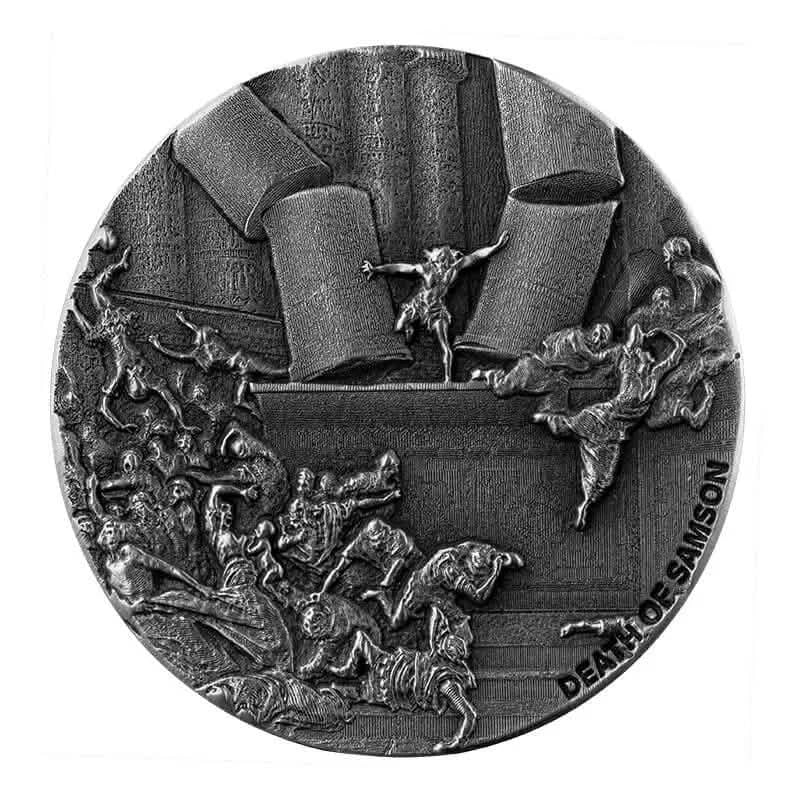 The high-relief design intricately portrays the collapsing temple, with Samson pushing against its pillars, symbolizing his ultimate act of faith and strength. The fine details bring this heroic and sacrificial moment to life, with the figures of the Philistine rulers in the background. The antique finish enhances the coin’s texture and depth, giving it a timeless, reverent appearance.