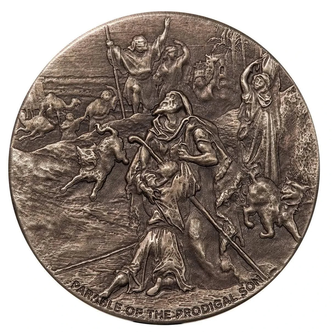 The coin features an exquisite high-relief design, illustrating the moment of the son’s return, with the father embracing him with open arms. The intricate details of the scene, from the emotional reunion to the lush surroundings, bring the story to life. The antique finish enhances the coin's depth, giving it a timeless, classical appearance that speaks to the enduring power of forgiveness and grace.