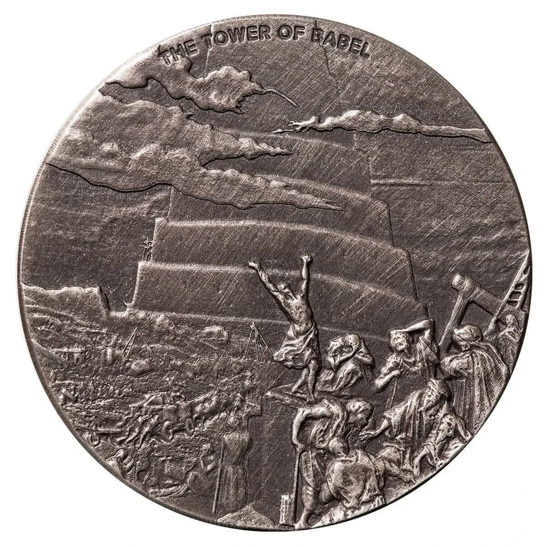 The coin features a stunning high-relief design, intricately illustrating the massive tower and the confusion among the builders, with detailed figures and a dramatic backdrop. The antique finish adds a timeless and textured feel to the design, emphasizing the depth of this biblical event and the divine lesson behind it. This coin serves as a powerful reminder of the limits of human pride and the sovereignty of God.
