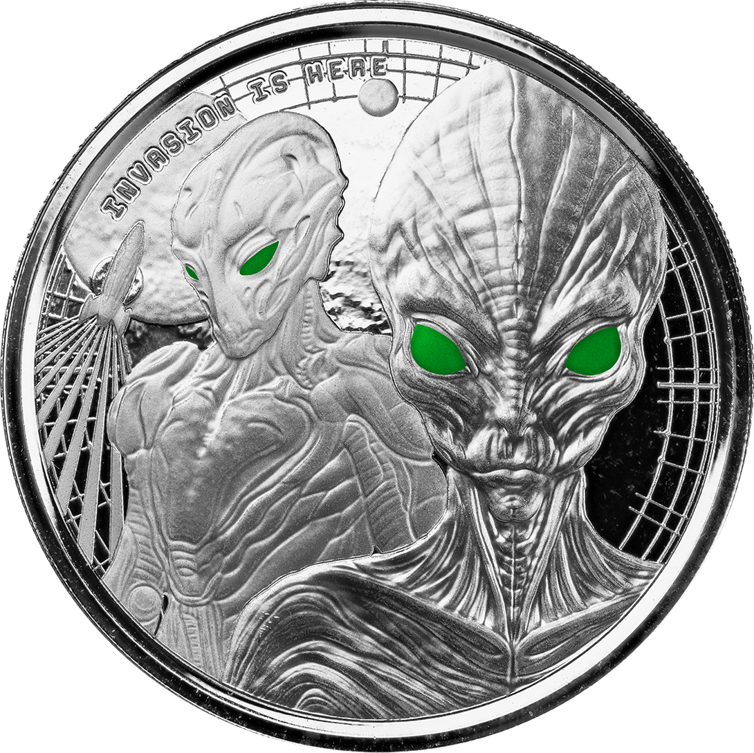 The 2023 Alien Series – “Invasion is Here” comes alive in vivid detail with this colorized 1 oz silver edition. Struck from 1 troy ounce of .999 fine silver, the design showcases two extraterrestrial beings — one clad in futuristic battle armor, preparing to board their rocket ship for an interstellar mission. The vibrant colorization highlights every element of the scene, creating a bold, eye-catching collectible that stands apart from the standard silver release.
