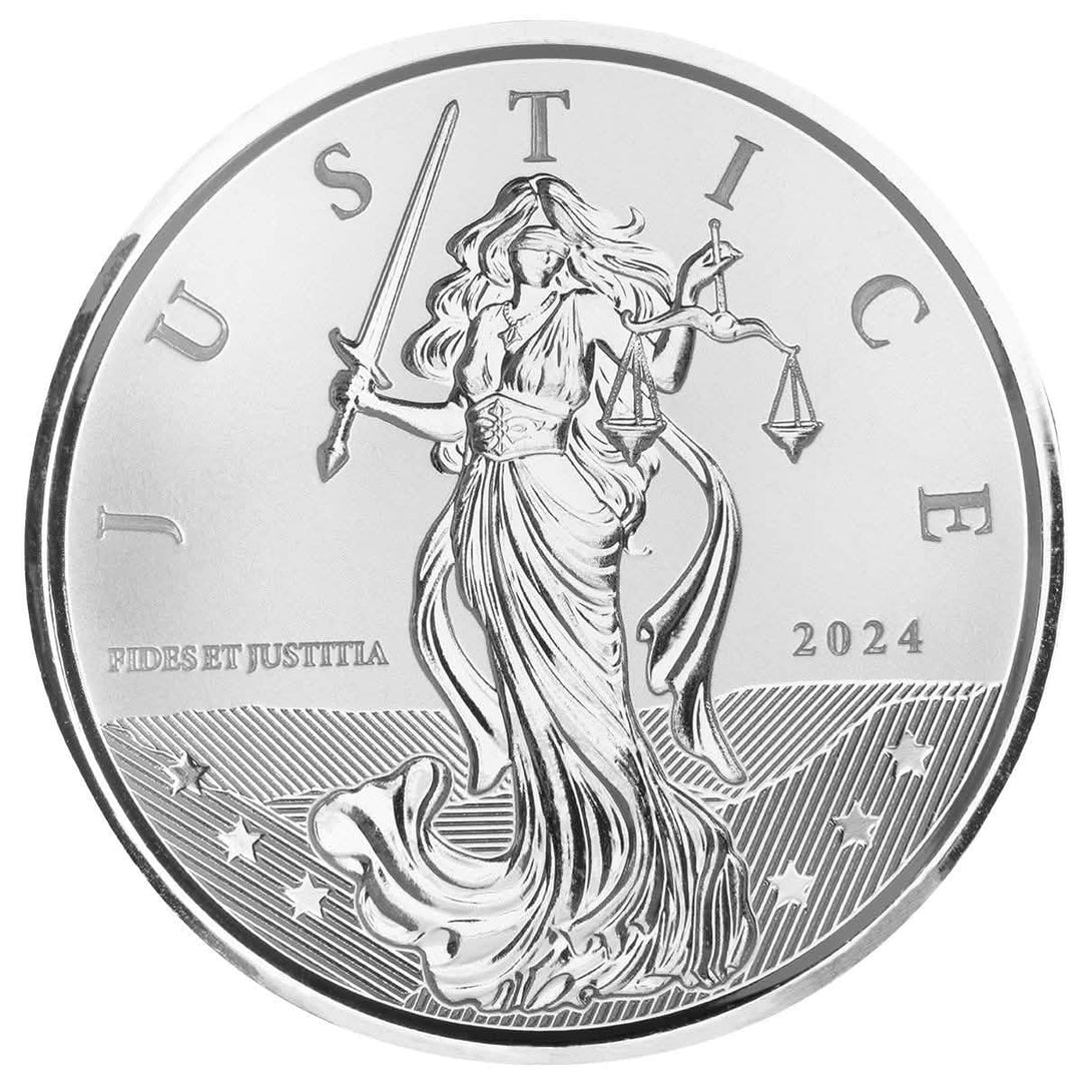Obverse: Features the timeless image of Lady Justice, blindfolded, holding the scales of justice in her left hand and the sword of truth in her right. The Latin motto “FIDES ET JUSTITIA” (Faith and Justice) completes the design.