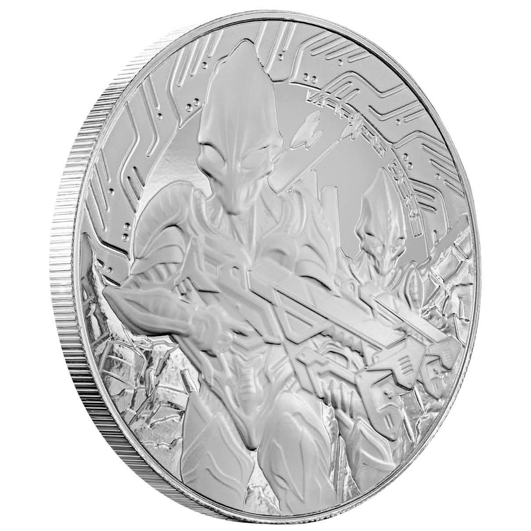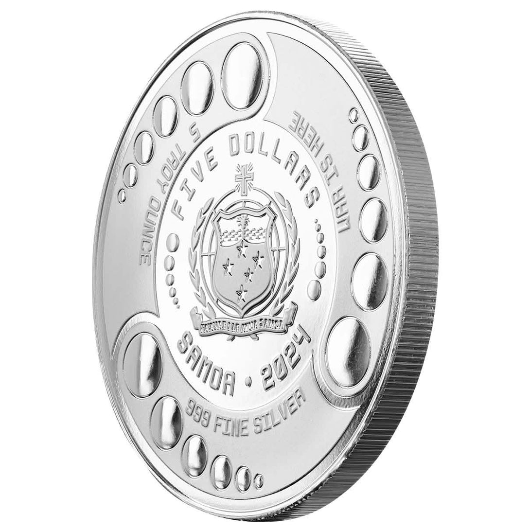 The 2024 Samoa Alien Series expands with an impressive 5 troy ounce .999 fine silver release, offering a larger canvas to showcase its thrilling intergalactic design. This year’s coin depicts two armored alien warriors — one aiming a futuristic charge gun while the other stands ready in the background. The extra-large surface brings out every detail of their elaborate battle gear, making this edition a true statement piece for serious collectors.
