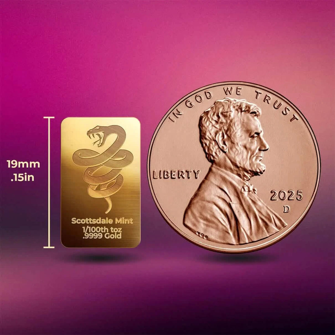 Celebrate the Year of the Snake with the world’s smallest mass-produced gold bar, minted by Scottsdale Mint. Struck from 1/100th of a troy ounce of .9999 pure gold, this collectible bar combines affordability, artistry, and investment value in a compact design.
