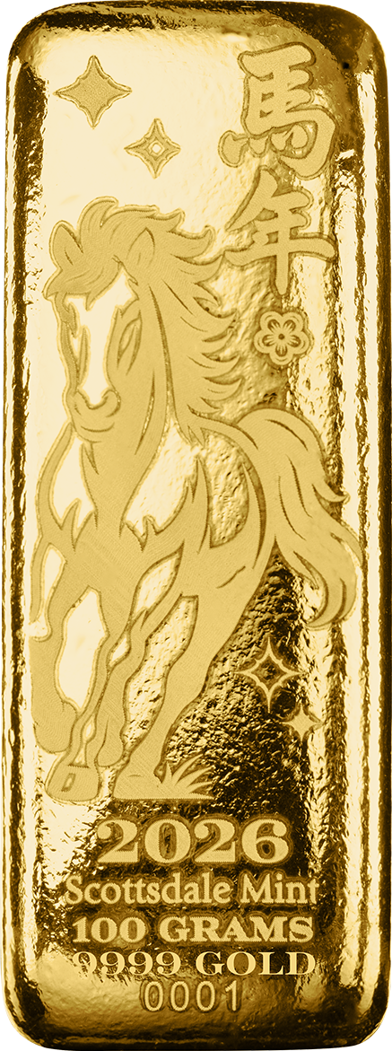 Step into 2026 with strength and success. Secure your 2026 Year of the Horse 1/100 oz Gold Bar today.