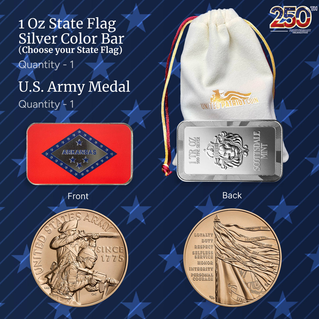 Show your state pride and salute American strength with the 250th Anniversary State Flag Silver & U.S. Army Medal Pack — a proud tribute to the states that built our nation and the soldiers who defend it.
