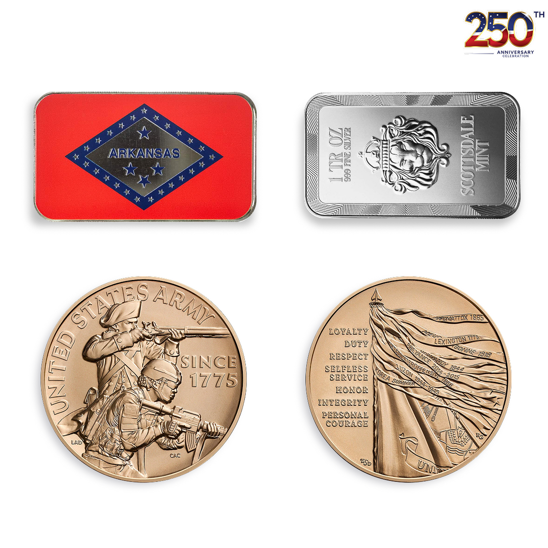 Each set includes a 1 oz .999 Fine Silver Bar featuring your chosen state flag in full color, paired with a 1 oz United States Army Medal honoring the courage, loyalty, and service of America’s fighting men and women.
