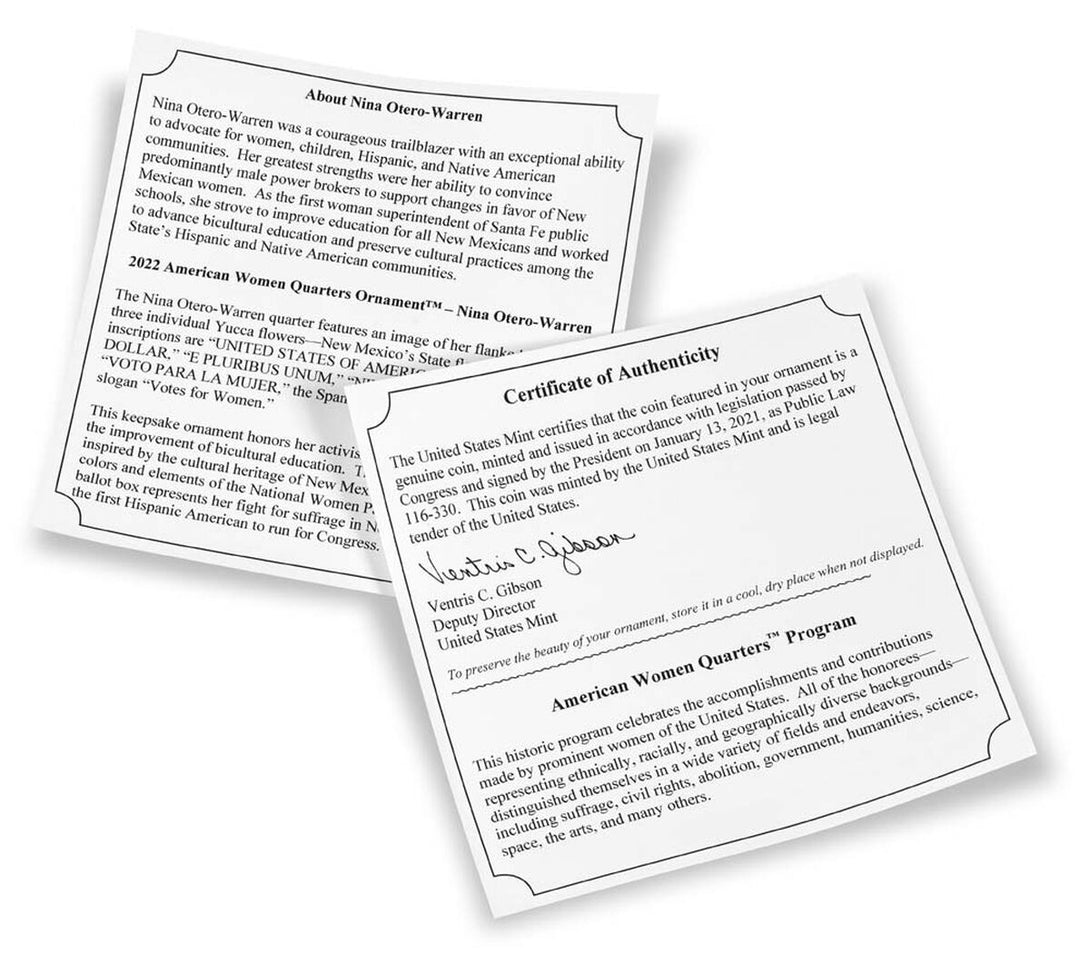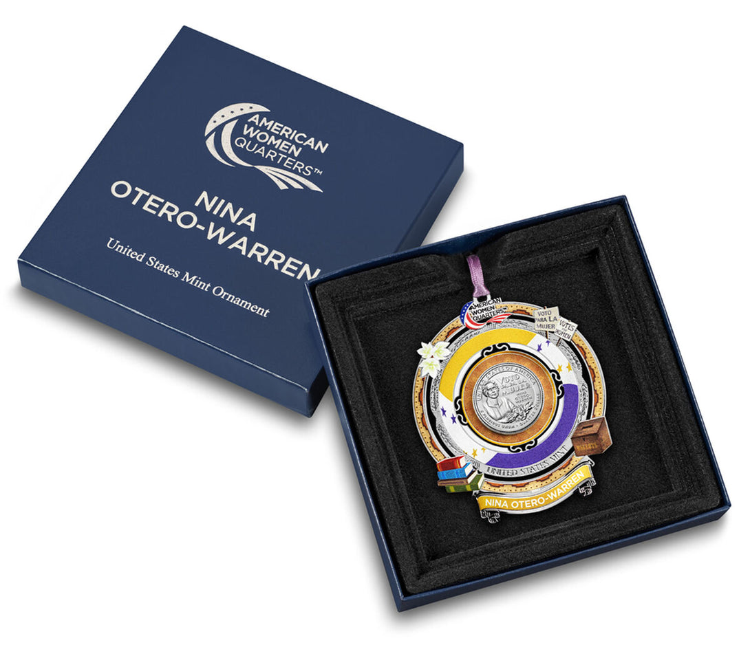 This collectible ornament arrives in a custom presentation box embossed with NINA OTERO-WARREN, 2022, and the American Women Quarters™ logo. It includes a certificate of authenticity, detailed design notes, and a biography of the honoree.