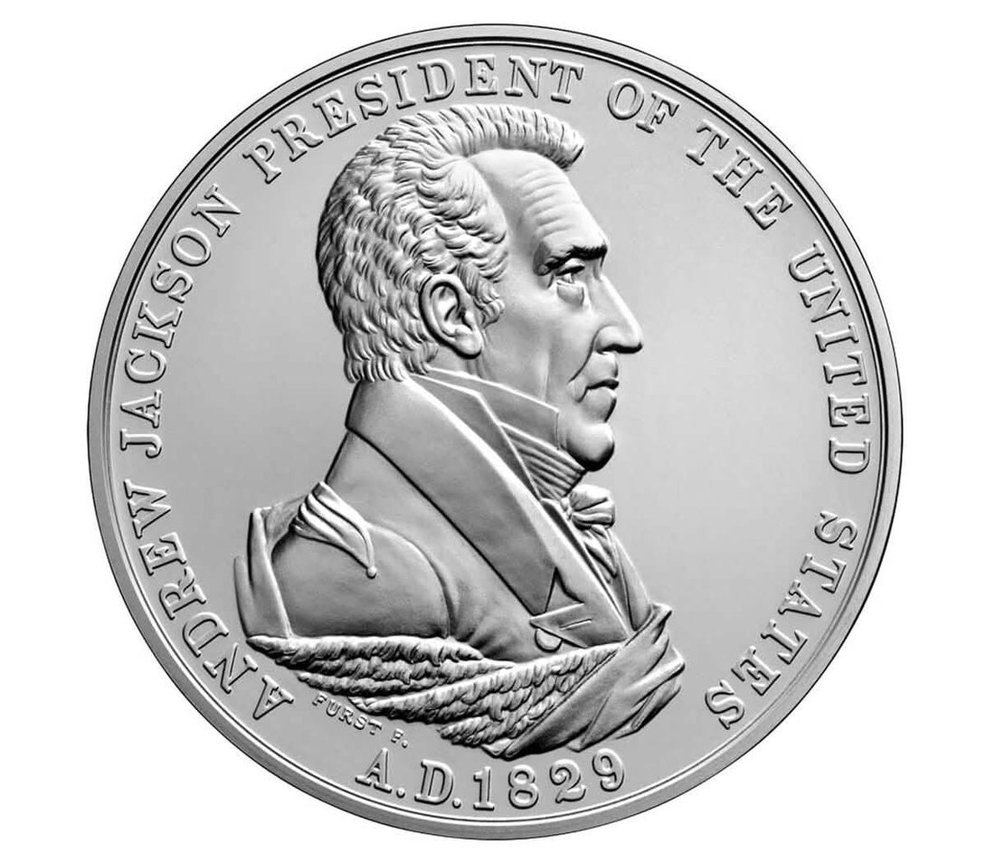 The obverse features a detailed portrait of Jackson, with the inscriptions “ANDREW JACKSON,” “PRESIDENT OF THE UNITED STATES,” and “A.D. 1829” marking the start of his presidency.