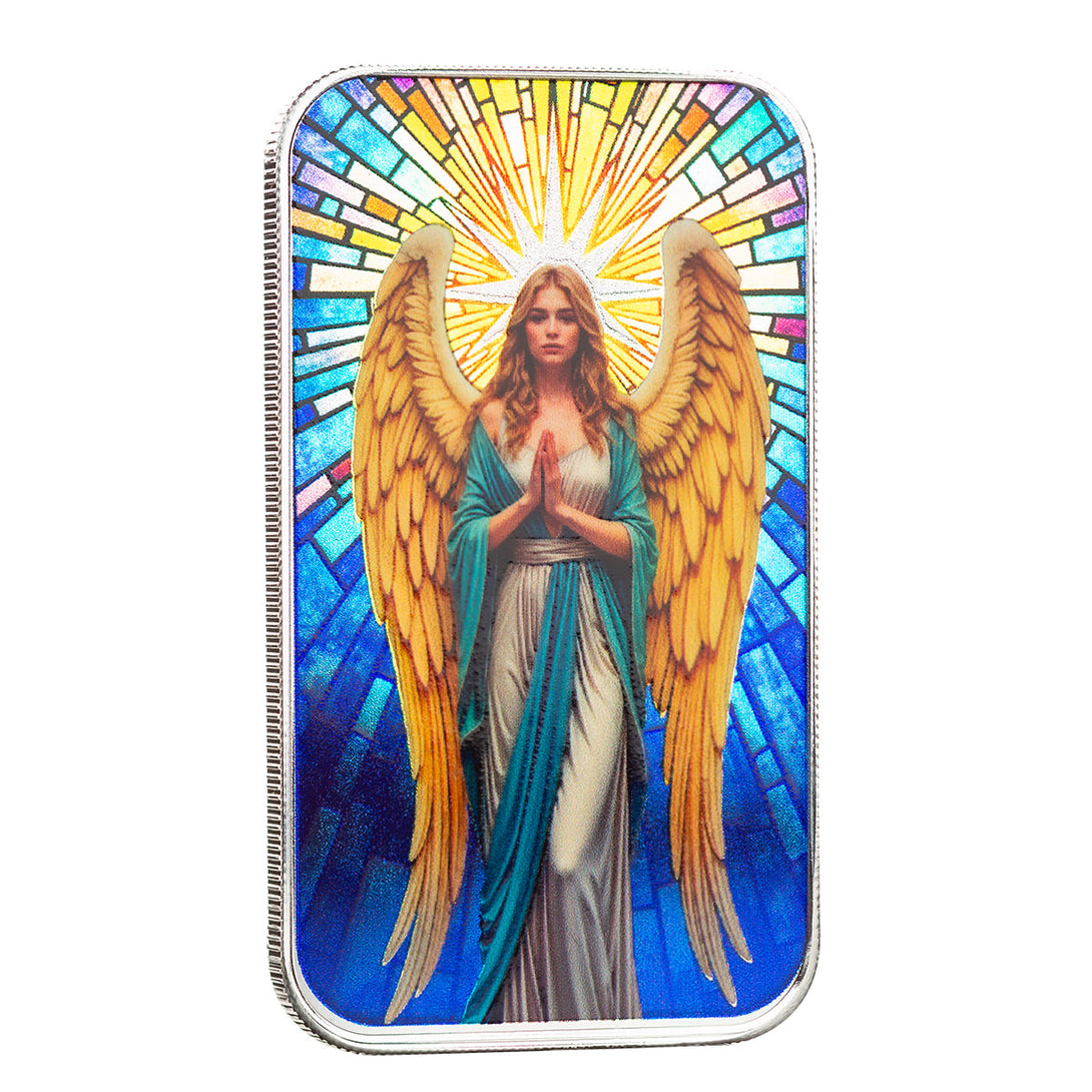 Celebrate the wonder of Christmas with the Angel Star of Bethlehem 1 oz Silver Color Bar, a radiant piece that beautifully combines faith and artistry. Struck from .999 fine silver, this bar features a breathtaking image of a graceful angel with magnificent golden wings spread wide, standing before a stunning stained-glass window alive with vibrant hues of blue, yellow, orange, and red.