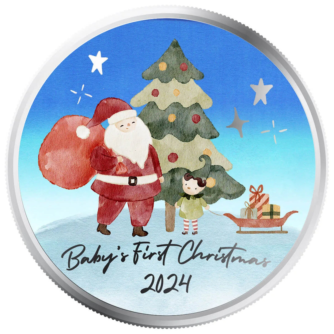 Celebrate the joy of a little one’s very first holiday season with the Baby’s First Christmas 1 oz Silver Round! This delightful design features a charming cartoon-style Santa, standing beside a sparkling Christmas tree with his cheerful elf and a sleigh brimming with colorful gifts. The cozy, snow-covered backdrop captures the magic and wonder of a child’s first Christmas, making it a keepsake filled with love and holiday cheer.