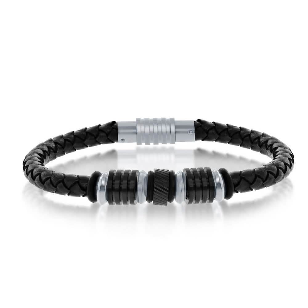Black & Silver Stainless Steel with Genuine Black Leather Bracelet