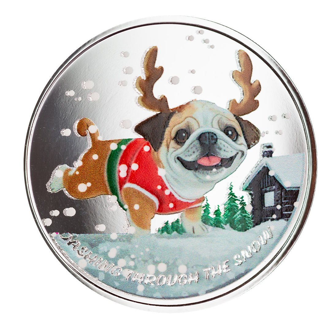 Bring a joyful burst of holiday spirit to your collection with the Dog Dashing Through the Snow 1 oz Silver Color Round! This charming design features an adorable pug racing across a snowy landscape, its floppy ears bouncing as it bounds through the winter wonderland. Dressed in a bright red Christmas sweater decorated with festive patterns and wearing a pair of playful reindeer antlers, this cheerful pup captures the excitement of the season. Behind the happy traveler, snowy hills and frosted evergreens set the perfect wintry backdrop.