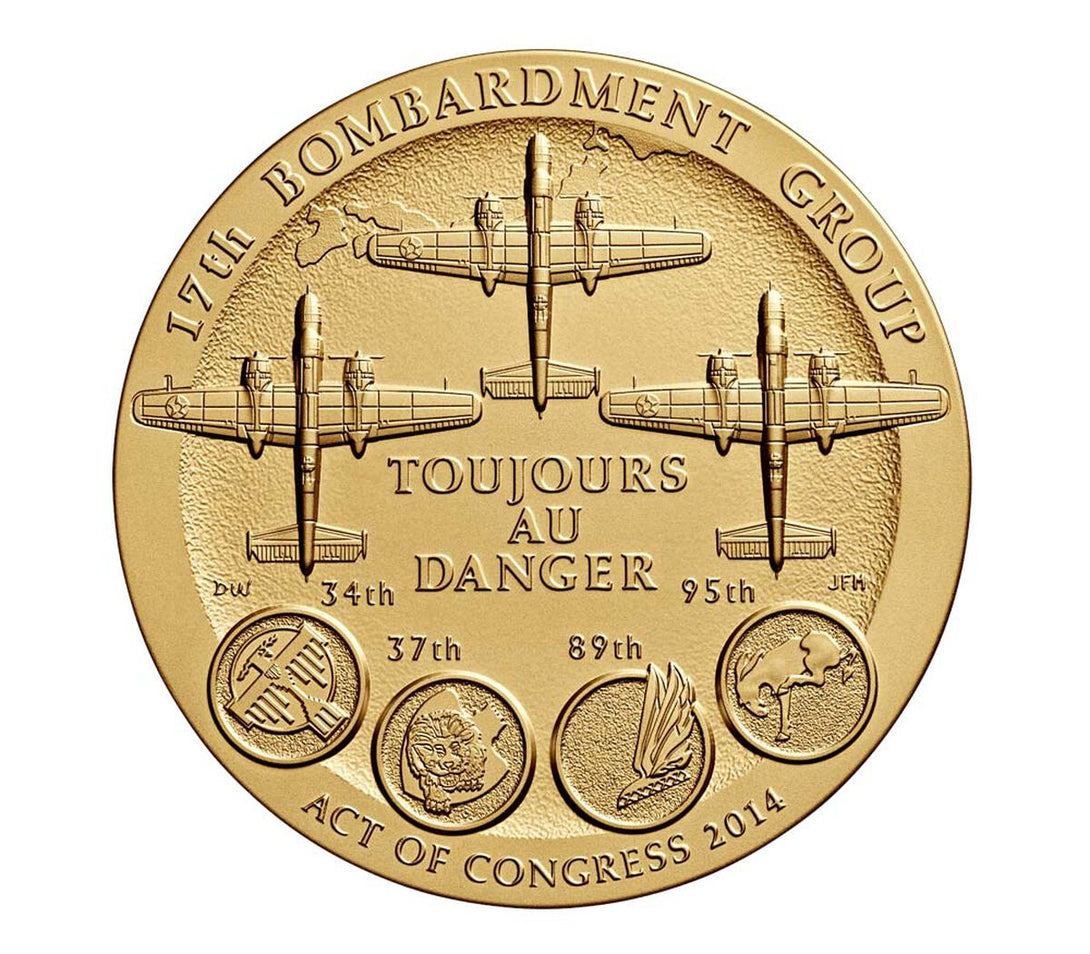 Reverse (Tails): Depicts B–25B Mitchell aircraft approaching their target, with four squadron patches representing the 34th, 37th, 89th, and 95th squadrons of the 17th Bombardment Group. Inscriptions read “17TH BOMBARDMENT GROUP,” “TOUJOURS AU DANGER,” and “ACT OF CONGRESS 2014.”