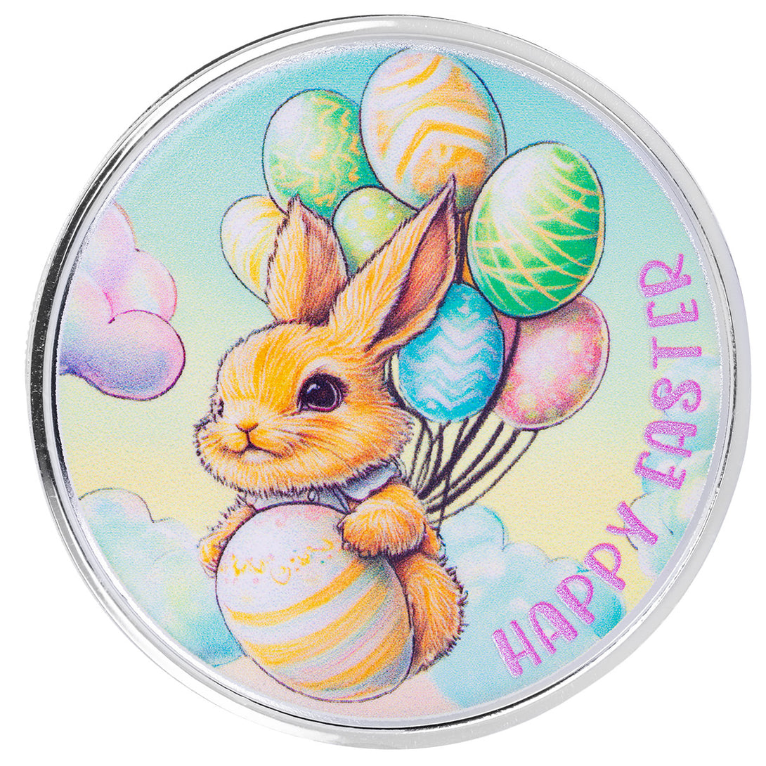 Whimsy takes flight with the Easter Collection 1 oz Silver Color Round, showcasing a playful bunny soaring through the sky. Holding onto a bouquet of egg-shaped balloons, the cheerful bunny balances atop a large Easter egg, drifting through a soft pastel-colored backdrop. This enchanting design captures the lighthearted magic and joy of Easter, making it a perfect keepsake for collectors and holiday enthusiasts alike.