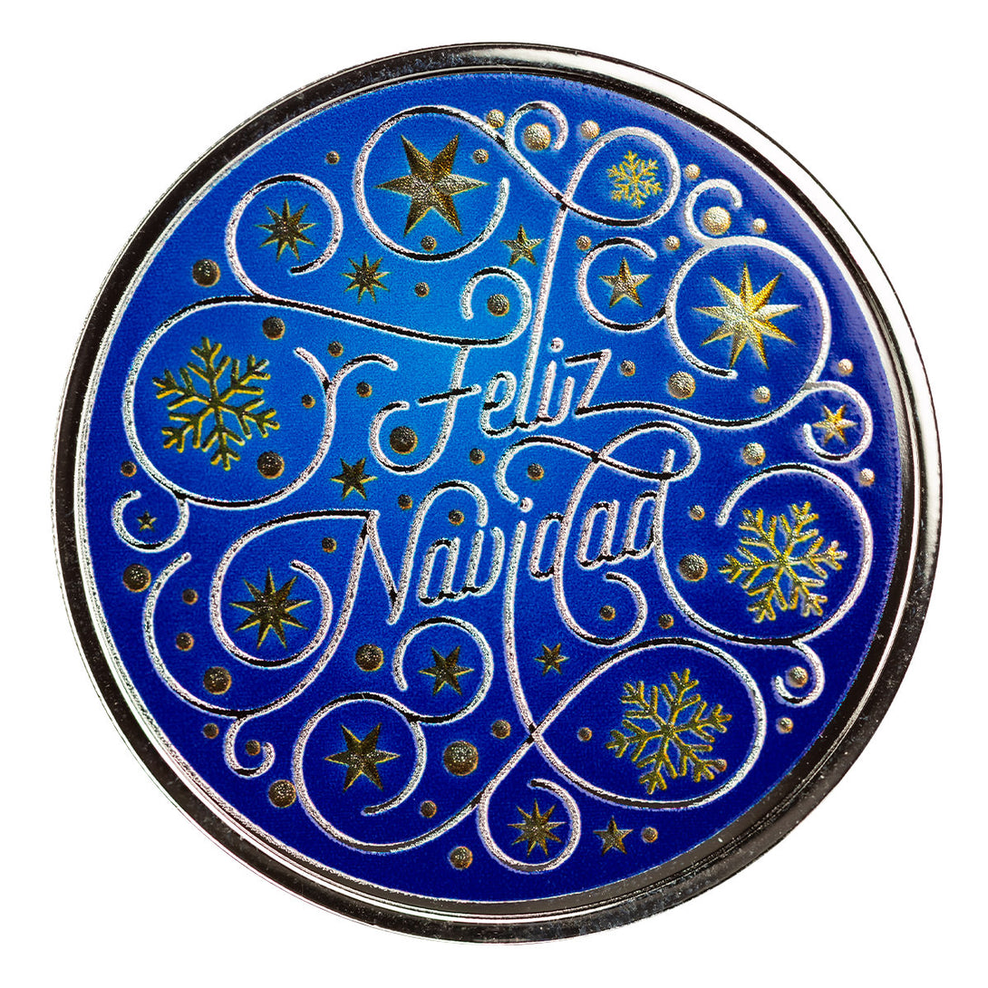 Celebrate the warmth and joy of the holiday season with the Feliz Navidad 1 oz Silver Color Round. This festive piece features the cheerful greeting “Feliz Navidad” shining brightly at the center, set against a serene snowy blue background. Surrounding the vibrant text, delicate white snowflakes dance across the design, creating a magical touch of winter wonder.