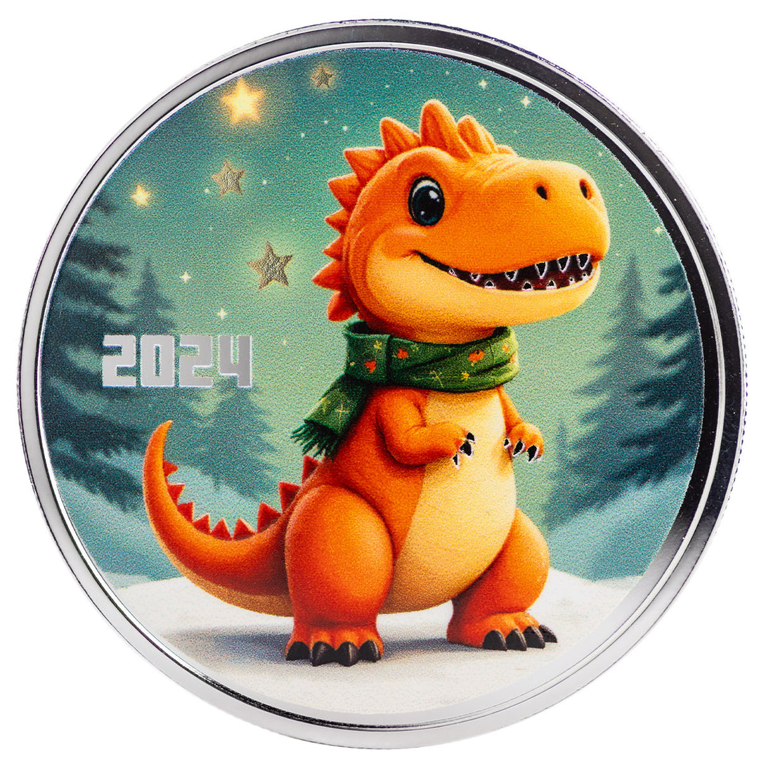 Bring a roar of holiday cheer with the 2024 Festive Dinosaur Silver Round! This playful design showcases an adorable orange dinosaur bundled in a cozy green scarf, surrounded by softly falling snowflakes. With its big friendly grin and bright, cartoon charm, this dino is ready to spread smiles and festive fun to collectors of all ages.