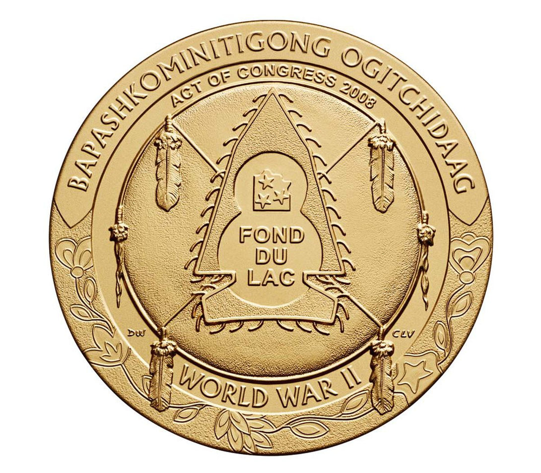 Reverse (Tails): Displays the Fond du Lac Band of Lake Superior Chippewa Tribe Seal. Inscriptions: “ACT OF CONGRESS 2008,” “WORLD WAR II,” and “BAPASHKOMINITIGONG OGITCHIDAAG” (meaning “Fond du Lac soldiers” or “Fond du Lac warriors”).