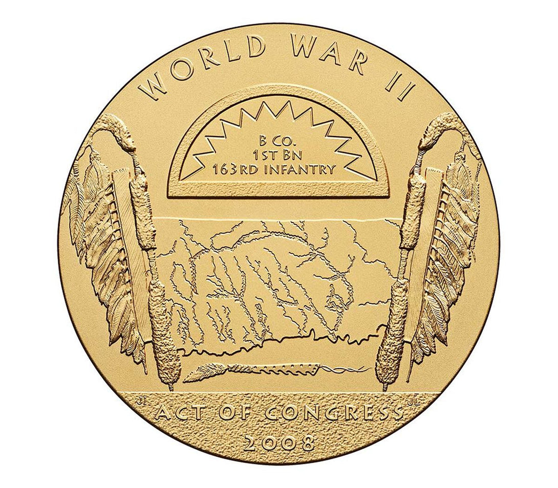 Reverse (Tails): Depicts the outline of the Fort Peck Indian Reservation (buffalo outlined by rivers and creeks), two eagle staffs, a Plains Indian dance whip, and the 41st Infantry Division patch. Inscriptions: “WORLD WAR II,” “ACT OF CONGRESS 2008,” and “B CO. 1ST BN 163RD INFANTRY.”