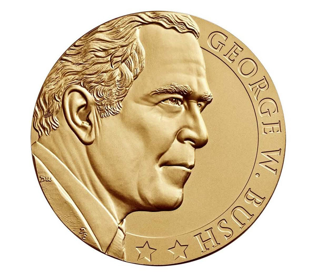 On the reverse, the north façade of the White House is prominently displayed. Above it is a quote from Bush’s 2007 address in Prague, emphasizing the global pursuit of liberty: