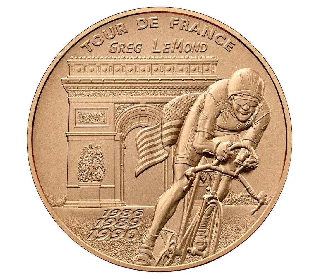 The front of the medal showcases Greg LeMond racing in full stride with the Arc de Triomphe in the background—a symbol of his Tour de France triumphs. It includes the inscriptions:
