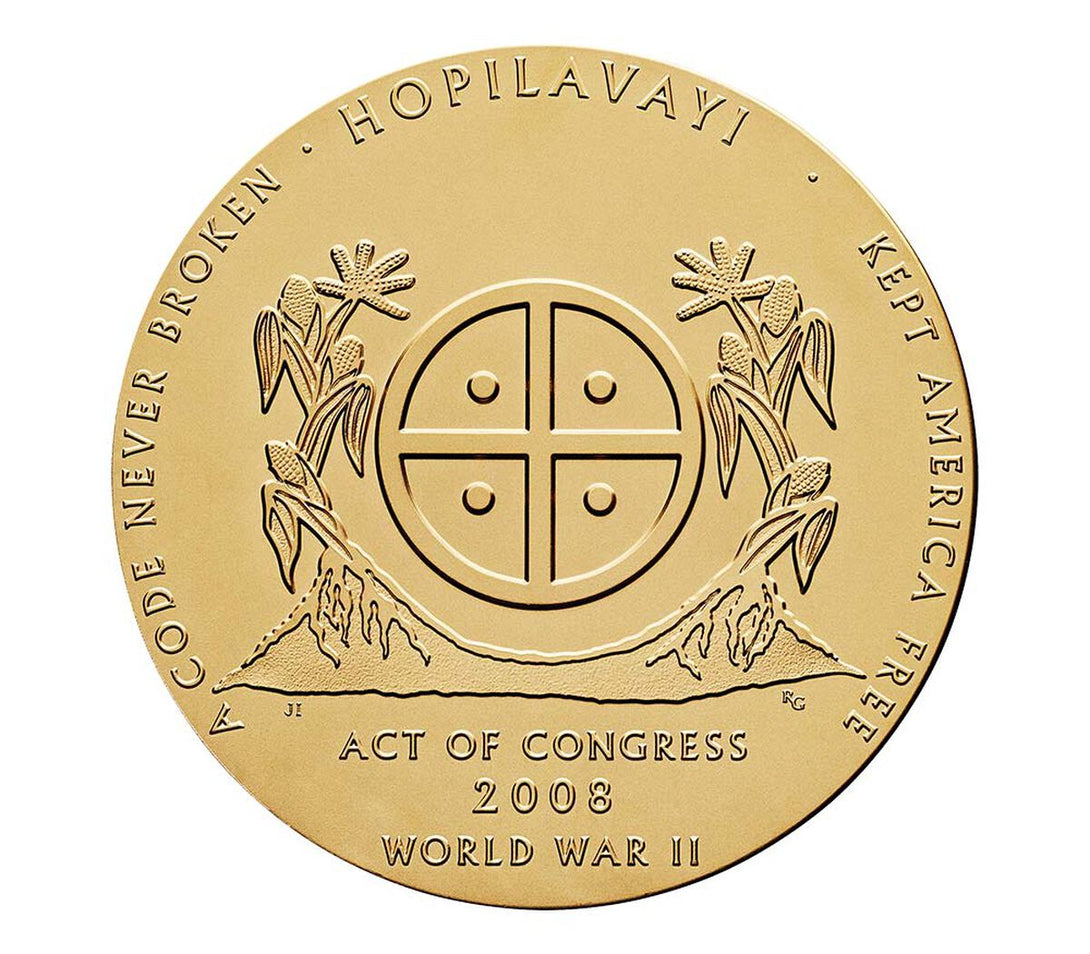 Reverse (Tails): Displays a variation of the Hopi Tribe flag, depicting a circle with dots, mountains, and corn stalks—symbols representing the Hopi way of life. Inscriptions include “WORLD WAR II,” “ACT OF CONGRESS 2008,” “A CODE NEVER BROKEN,” “KEPT AMERICA FREE,” and “HOPILAVAYI” (Hopi language).