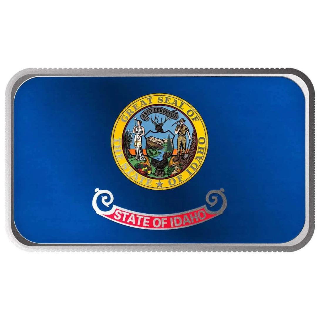 Each bar is struck from 1 troy ounce of .999 fine silver and enhanced with vivid colorization, showcasing the Idaho state flag with stunning clarity. Perfect for collectors, silver investors, or anyone with a connection to Idaho, this piece is a meaningful keepsake and valuable collectible.