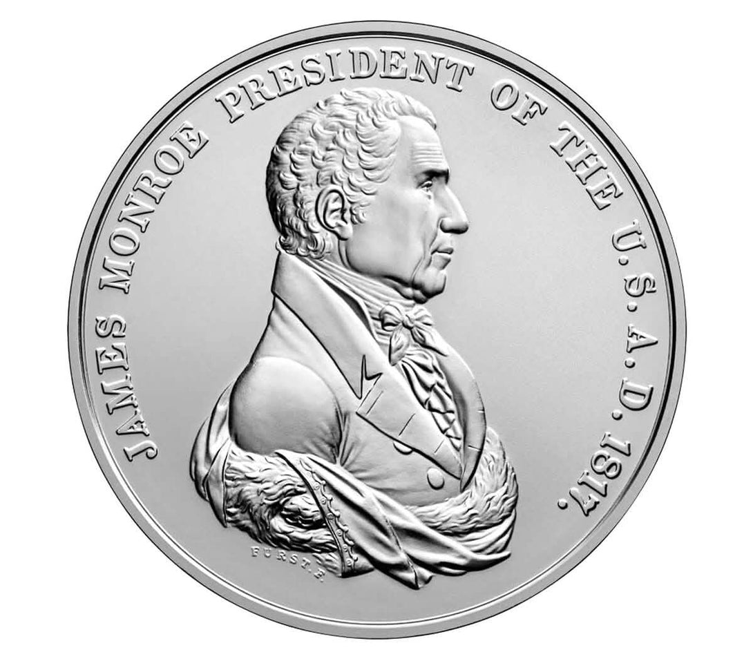 The obverse displays a profile portrait of President Monroe, along with the inscriptions “JAMES MONROE,” “PRESIDENT OF THE U.S.,” and the year “A.D. 1817,” commemorating the start of his presidency.