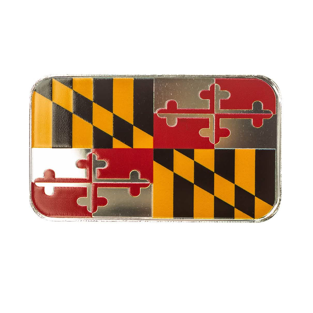 Each bar is struck from 1 troy ounce of .999 fine silver and colorized in vivid detail to capture the complexity and boldness of Maryland’s flag. A perfect piece for collectors, silver investors, or anyone proud to call Maryland home, this bar represents both beauty and value.