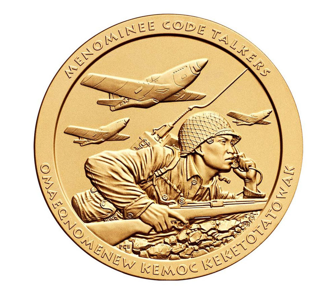 Obverse (Heads): Features a Menominee Code Talker using communication equipment while three P-51 Mustangs fly overhead. Inscriptions: “MENOMINEE CODE TALKERS” and “OMAEQNOMENEW KEMOC KEKETOTATOWAK,” which translates to “Menominee Secretly Talk to Each Other.”