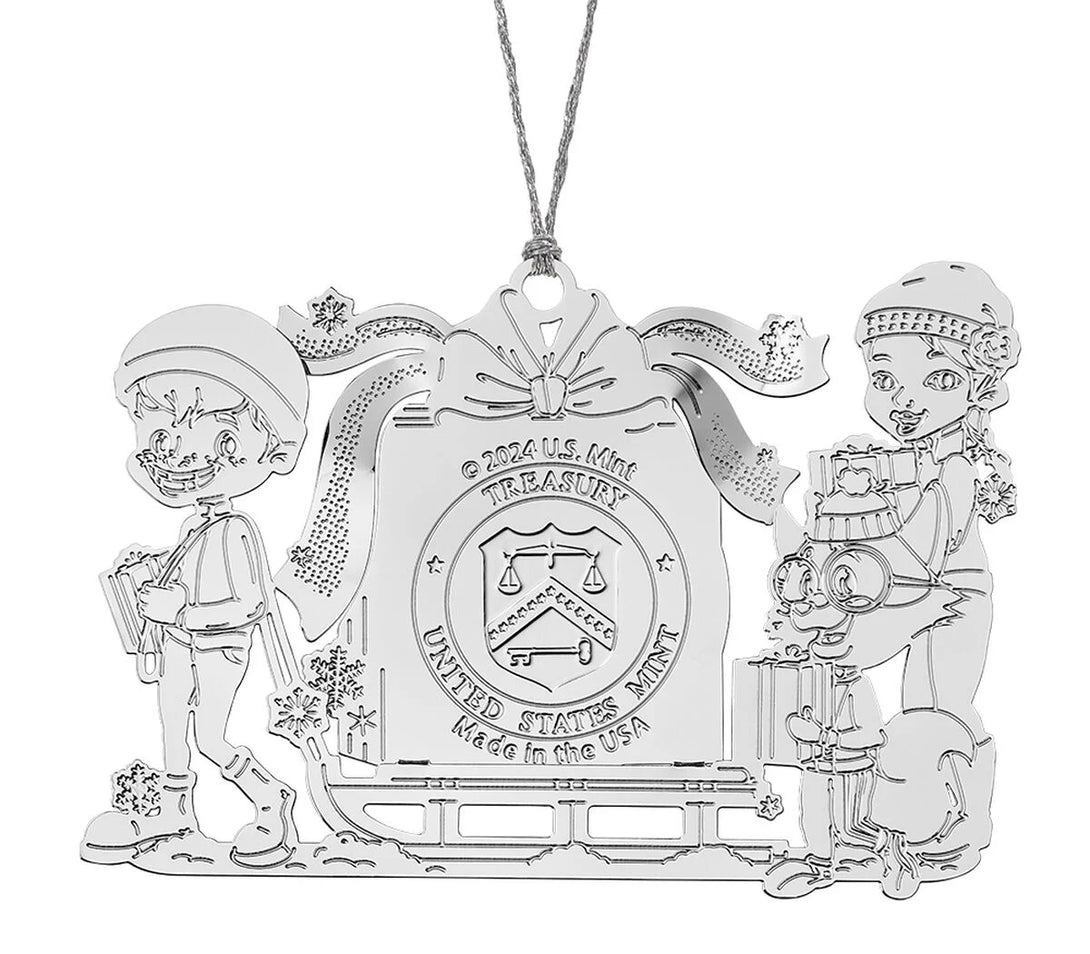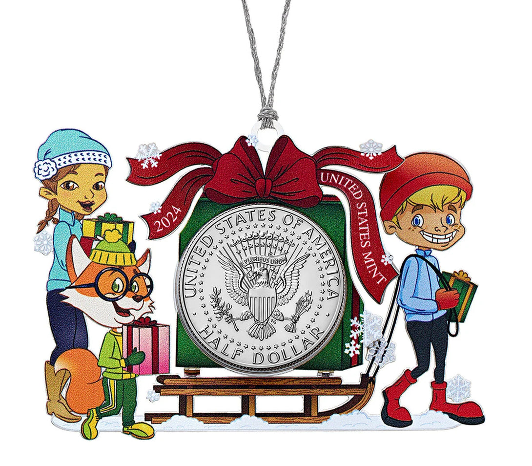 This year’s design features three Mighty Minters™—Lina, Eli, and Timothy—spreading cheer as they deliver gifts through the snow. At the center of the ornament, Timothy pulls a large present on a sleigh, with the reverse (tails side) of the Kennedy Half Dollar displayed prominently. A bold red ribbon with “2024” and “United States Mint” adorns the top, while silver snowflakes accent the festive design.