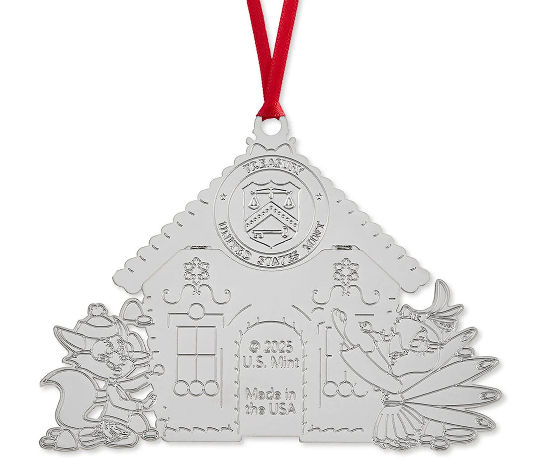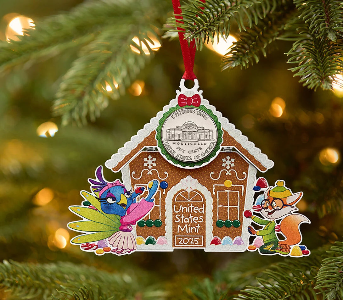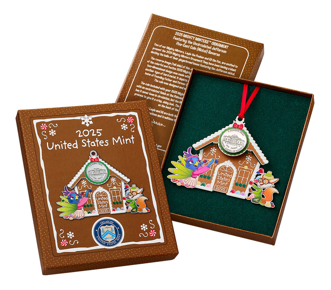 This year’s design features two beloved Mighty Minters™ characters — Layla and Eli — joyfully decorating a festive gingerbread house ornament. At the top of the gingerbread house sits the 2025 Jefferson nickel, surrounded by a bright green wreath and topped with a cheerful red bow. Icing snowflakes adorn the walls and doorway, while the inscriptions “United States Mint” and “2025” appear on the front door, completing the sweet and colorful holiday scene.