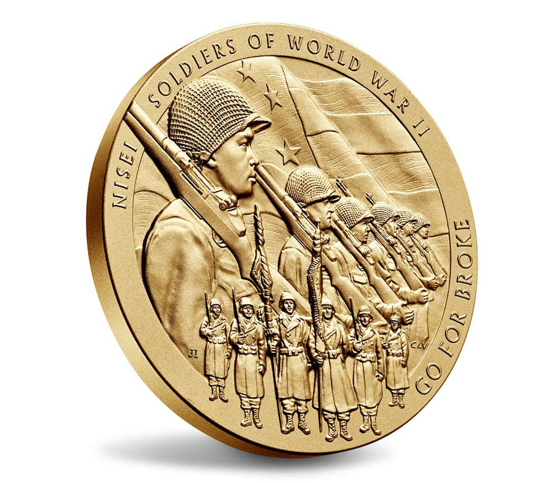 Obverse (Heads): Designed by Joel Iskowitz and sculpted by Charles L. Vickers, the design features Nisei soldiers from both theaters of war, with the 442nd RCT color guard in the lower field. The outer rim inscriptions read “NISEI SOLDIERS OF WORLD WAR II” and “GO FOR BROKE,” the motto of the 442nd RCT that represents the dedication of all three units.