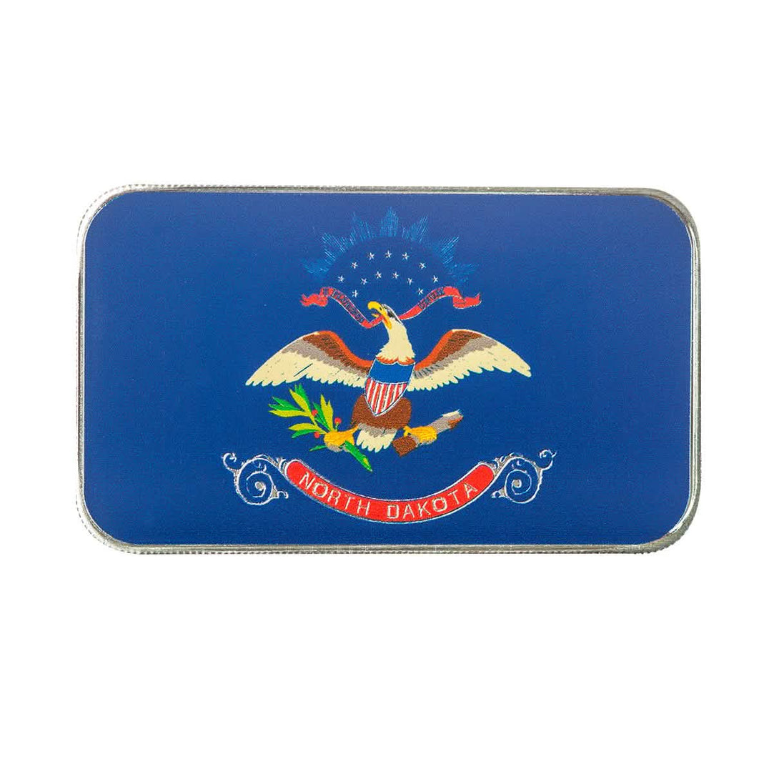 Celebrate the Peace Garden State with this finely crafted 1 oz Silver Color Bar featuring the official State Flag of North Dakota. With its rich symbolism and historic imagery, the flag embodies the state’s pride, values, and commitment to liberty.