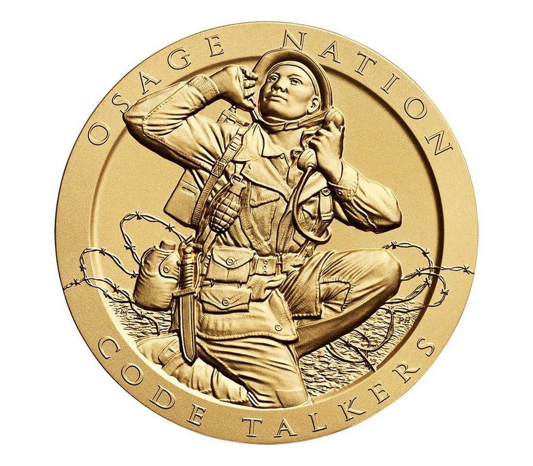 Obverse (Heads): Features a Code Talker focused on his task, with barbed wire representing the dangers faced in combat. Inscriptions: “OSAGE NATION” and “CODE TALKERS.”