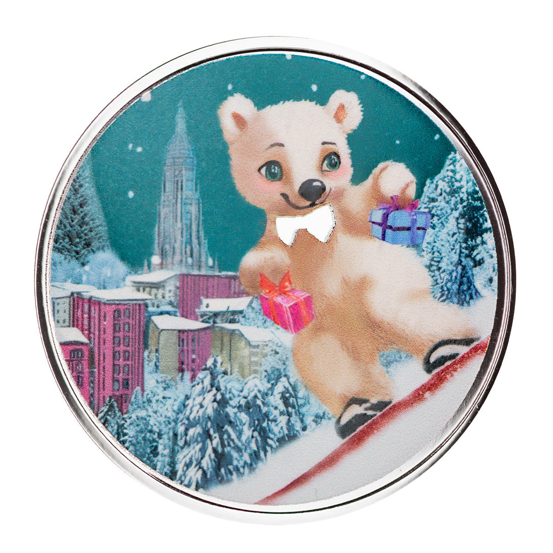 Bring a burst of winter fun to your collection with the Polar Bear Snowboarding Silver Color Round! This playful design features a cool polar bear mid-snowboard trick, carving through fresh powder with effortless style. Dressed in a vibrant scarf and protective goggles, this adventurous bear captures the excitement of the slopes and the carefree joy of the holiday season.