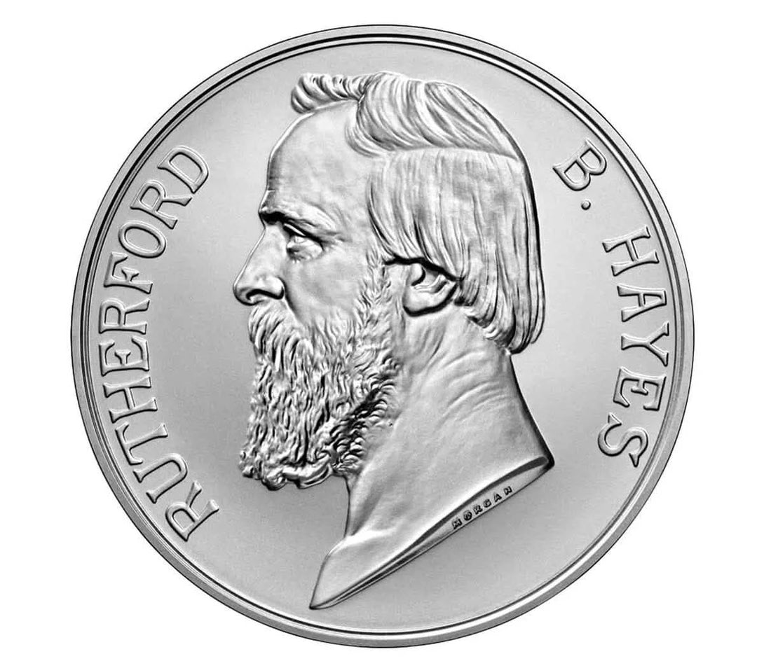 This silver medal honors Rutherford B. Hayes, the 19th President of the United States, who served from 1877 to 1881. Before becoming president, Hayes built a distinguished public service career as a U.S. Congressman and later as Governor of Ohio.