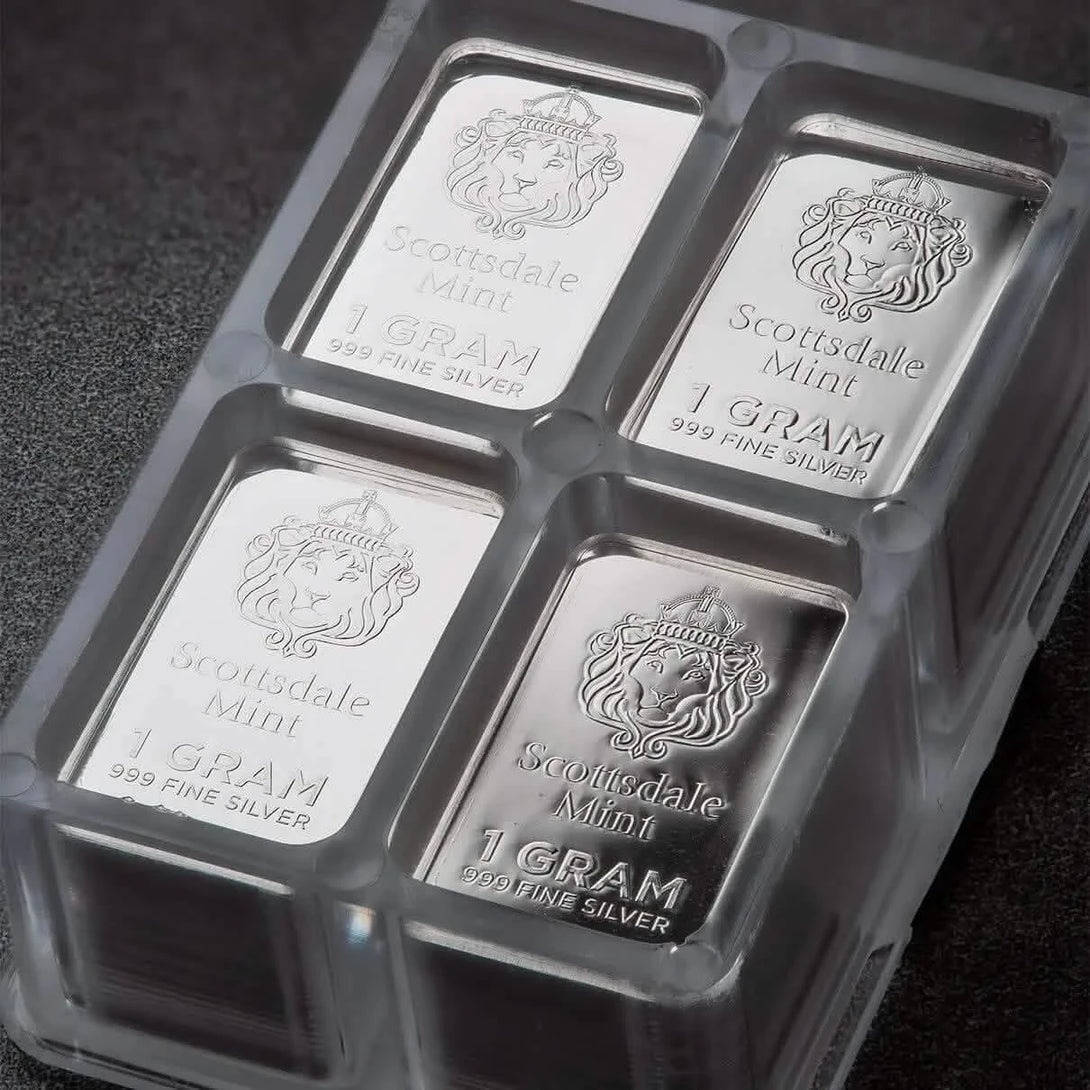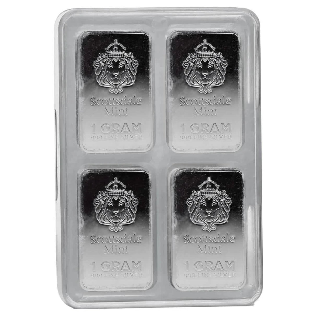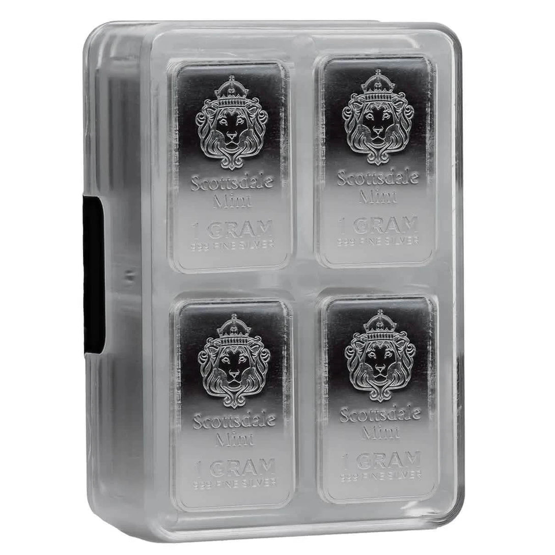 Build your silver reserves with the Scottsdale Mint Silver Prepper Bars Box, containing 100 individual 1 gram .999 fine silver bars — each stamped with the iconic Scottsdale Lion Hallmark.