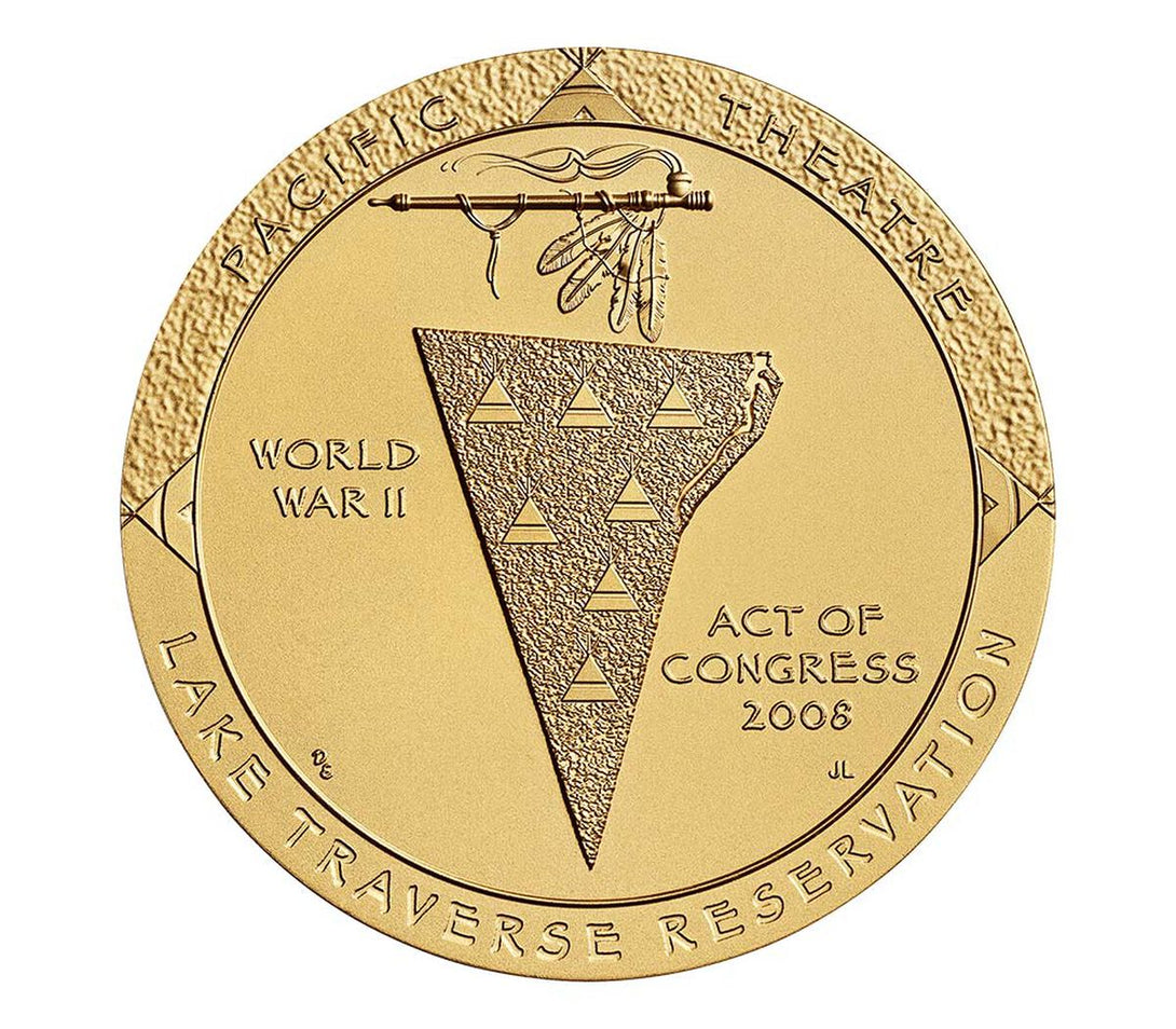 Reverse (Tails): Features a variation of the Sisseton Wahpeton Oyate Tribe seal, showing the boundaries of the reservation with seven tipis representing the seven districts of the Lake Traverse Reservation. Inscriptions include “PACIFIC THEATRE,” “WORLD WAR II,” “LAKE TRAVERSE RESERVATION,” and “ACT OF CONGRESS 2008.”