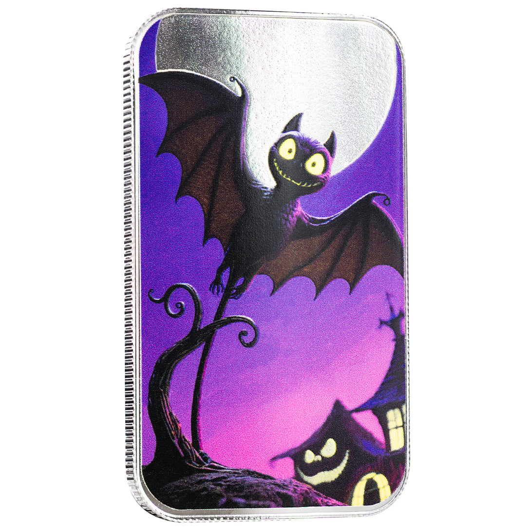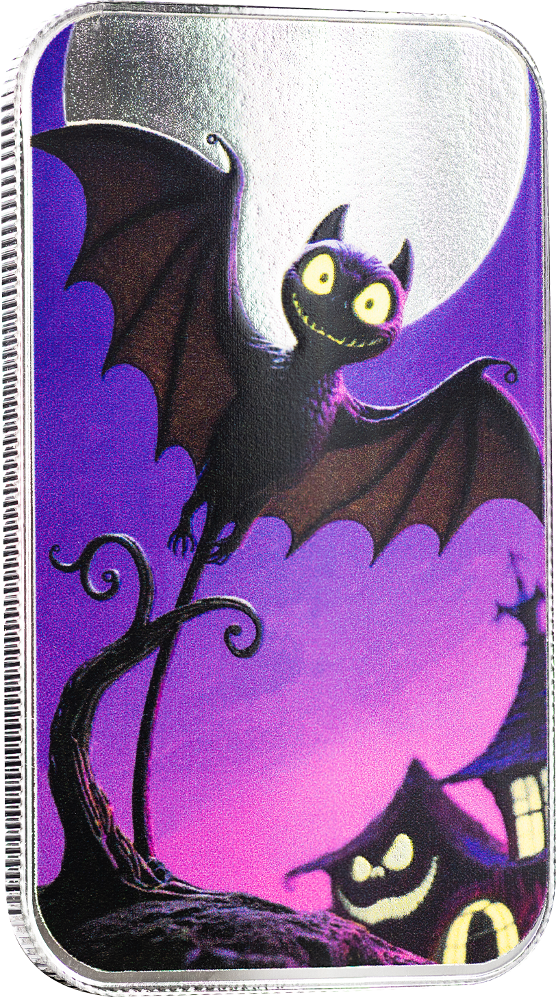 This collectible silver bar showcases a wide-eyed bat gliding across a glowing full moon, with a mysterious haunted house lurking in the distance. The vivid colorization brings this eerie night scene to life, blending spooky charm with fine artistry.