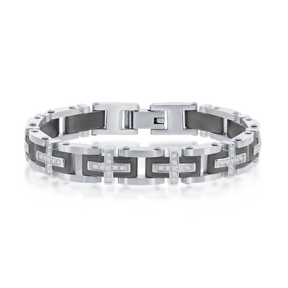 Stainless Steel Black and Silver CZ Cross Link Bracelet