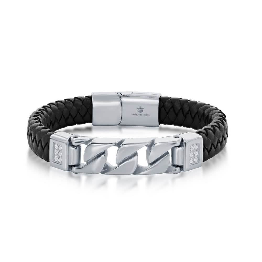Stainless Steel Genuine Black Leather Curb Link Bracelet