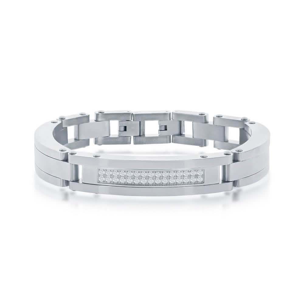 Sleek and modern, this Stainless Steel Bracelet features a micro pave CZ-accented ID link design for subtle sparkle and refined style. Crafted from polished stainless steel, it combines durability with contemporary elegance, making it perfect for everyday wear or layering with other pieces.