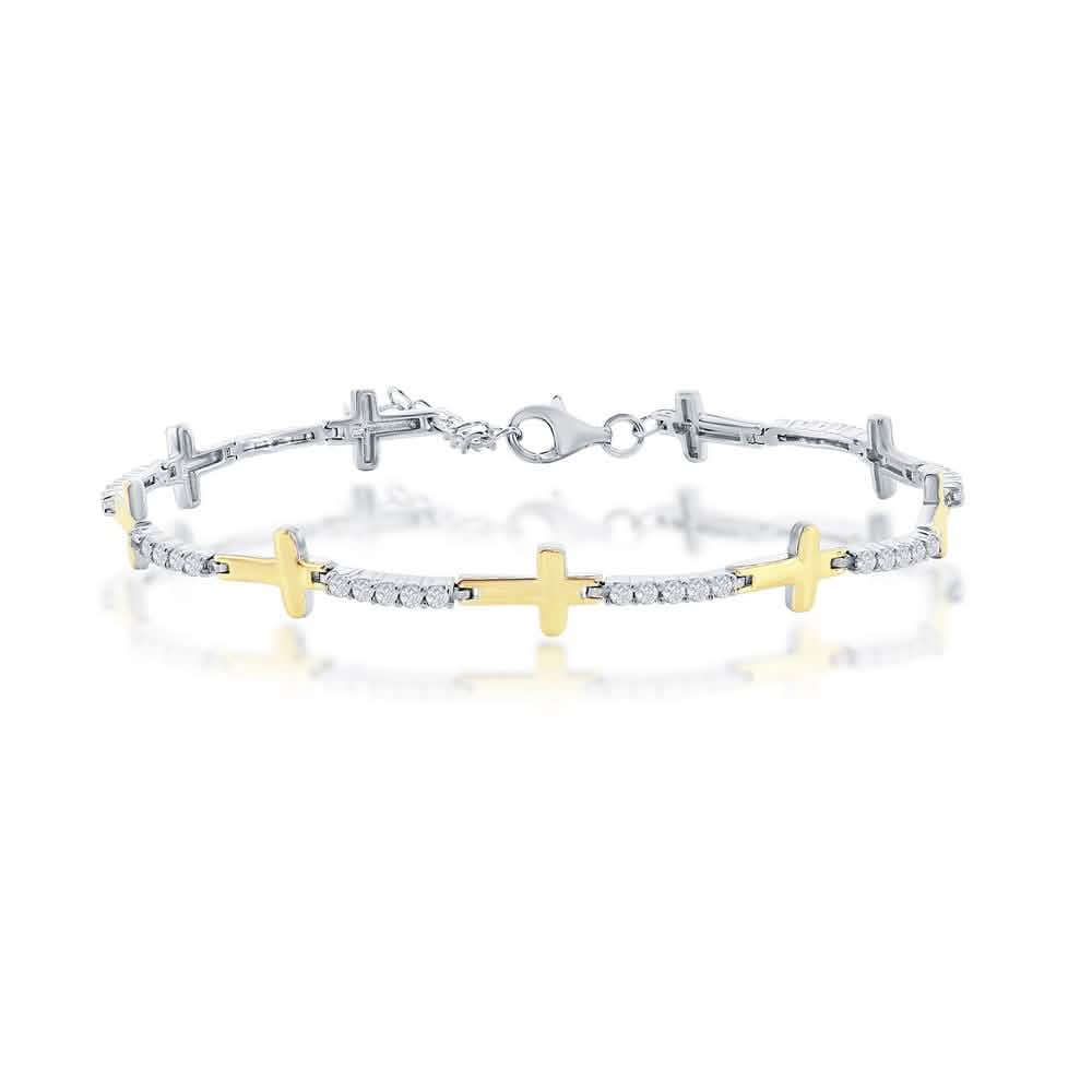 Sterling Silver, Sideways Cross & CZ Bracelet – Gold Plated