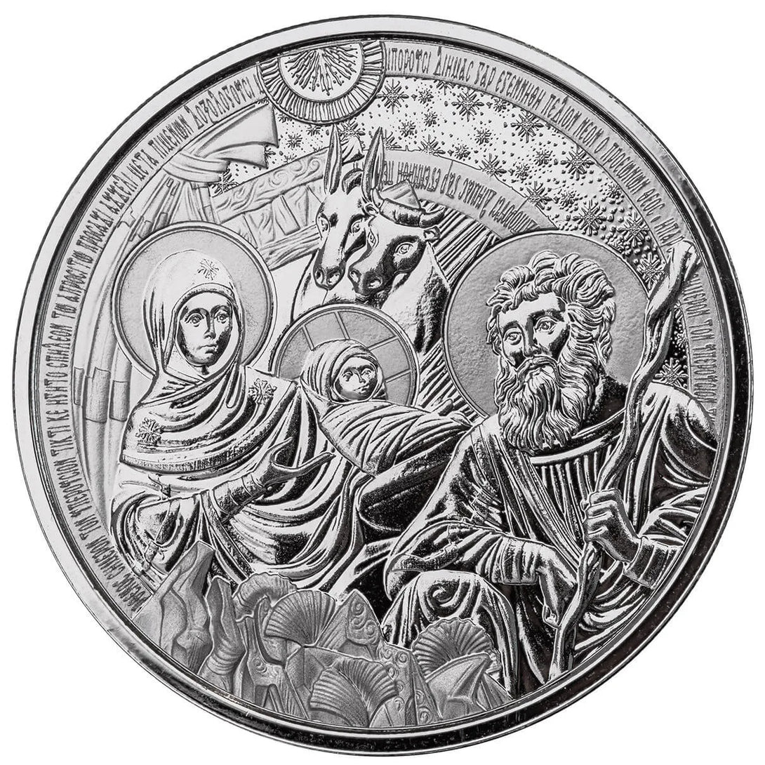 Reverse: Showcases a beautifully detailed Nativity scene, with Mary and Joseph lovingly watching over baby Jesus in the manger. Surrounding the scene are livestock, palm branches, and a starlit sky crowned by the Bethlehem Star. Along the rim, a sacred hymn appears in both English and Greek, honoring the miraculous birth:
