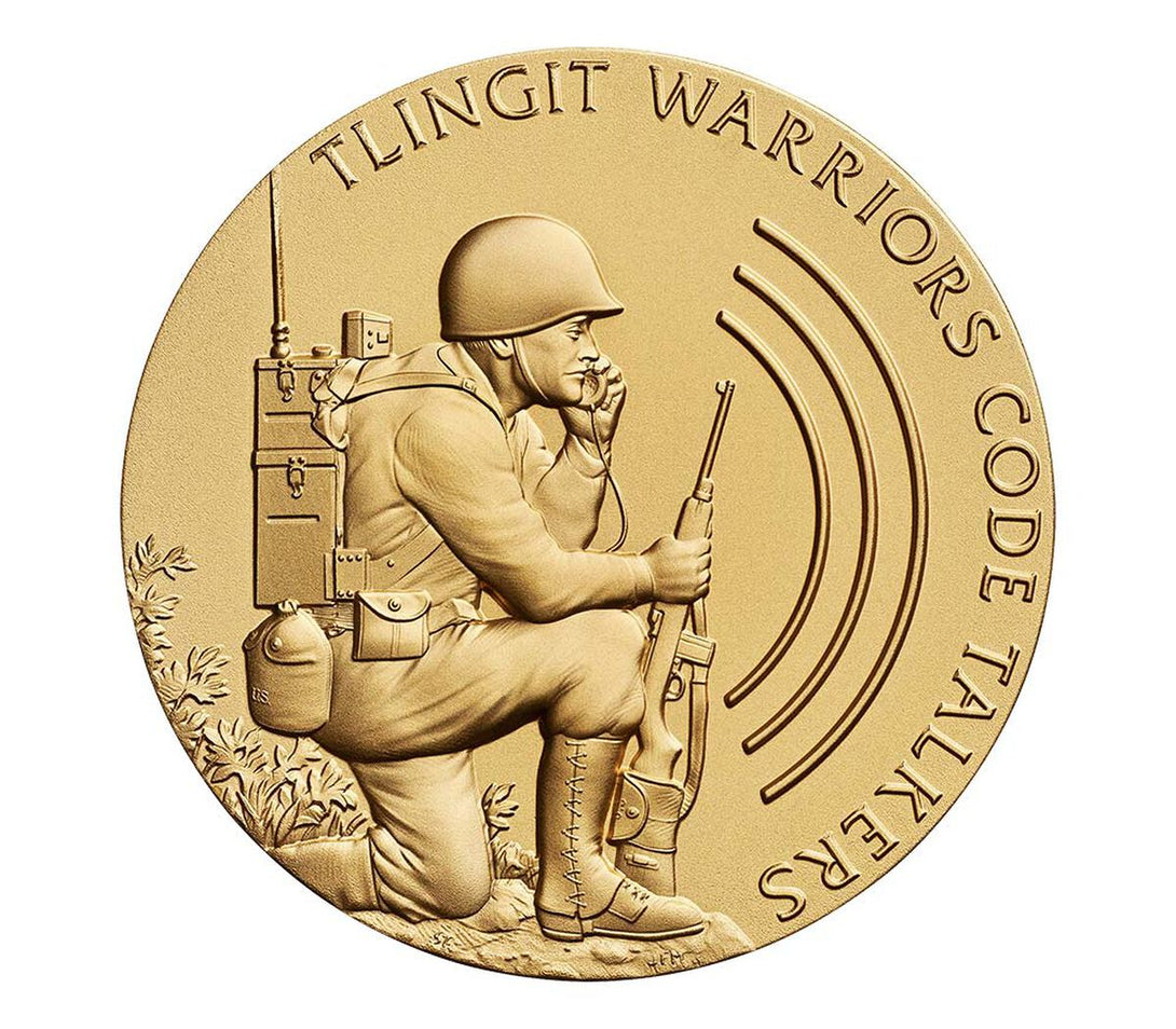 Obverse (Heads): Depicts a soldier kneeling on his right knee, holding a rifle in his left hand while sending a coded message via radio. The raised antenna and three semicircles symbolize the transmission of radio signals. Inscription: “TLINGIT WARRIORS CODE TALKERS.”
