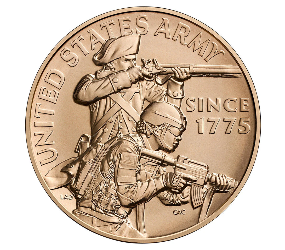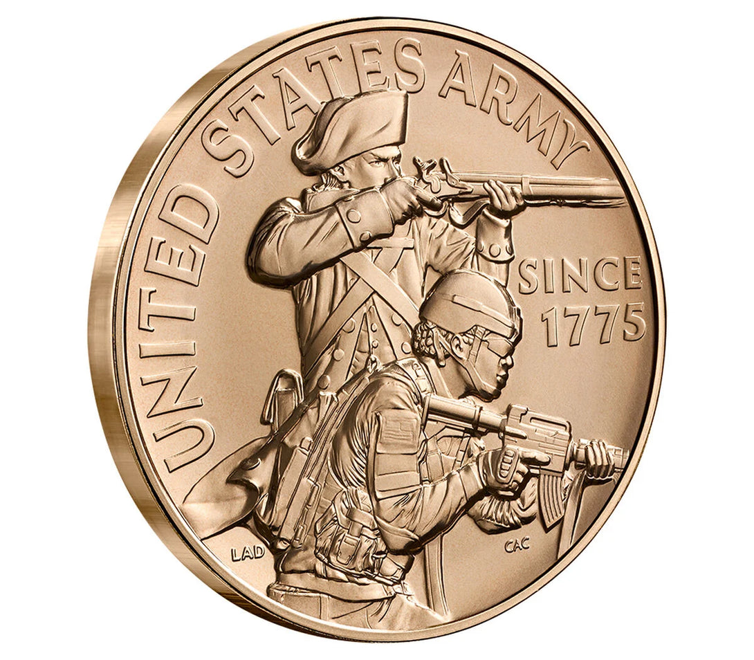 Obverse (Heads): Features Continental and modern soldiers “at the ready” with the weapons of their eras, symbolizing the Army’s enduring mission from its founding to today. Inscriptions read “UNITED STATES ARMY” and “SINCE 1775.”