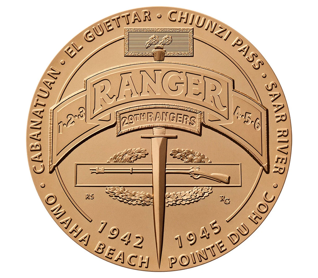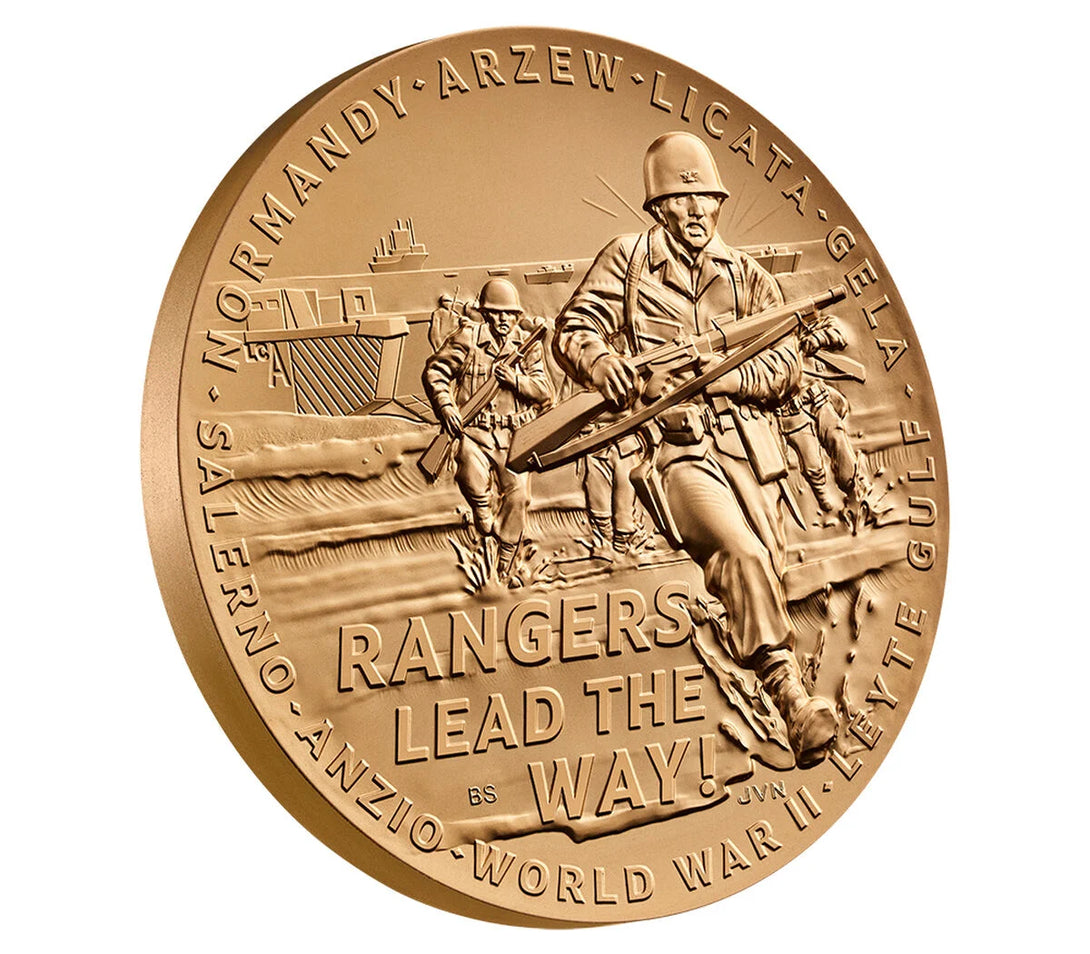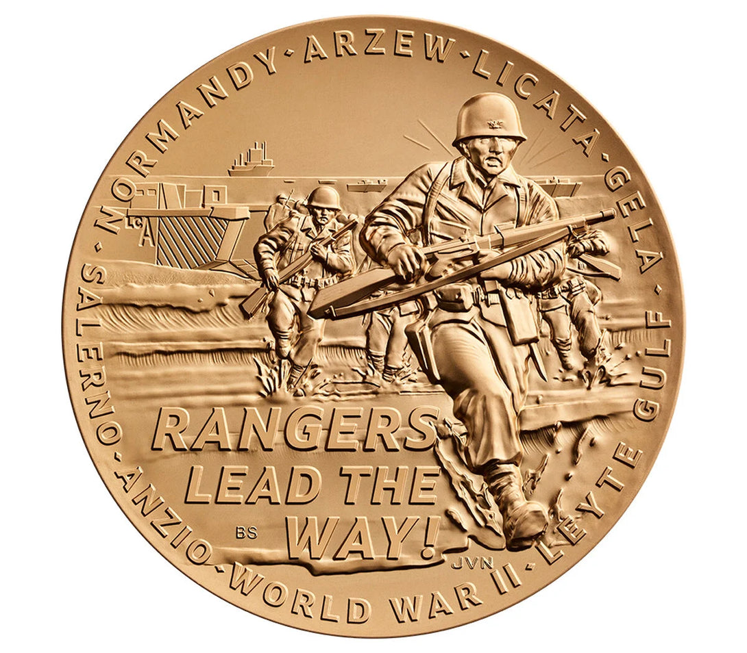 Obverse (Heads): Depicts Rangers disembarking a Landing Craft Assault (LCA) and charging a beach, with their motto “RANGERS LEAD THE WAY!” Seven Ranger combat landings—“ANZIO,” “SALERNO,” “NORMANDY,” “ARZEW,” “LICATA,” “GELA,” “LEYTE GULF”—border the design along with “WORLD WAR II.”